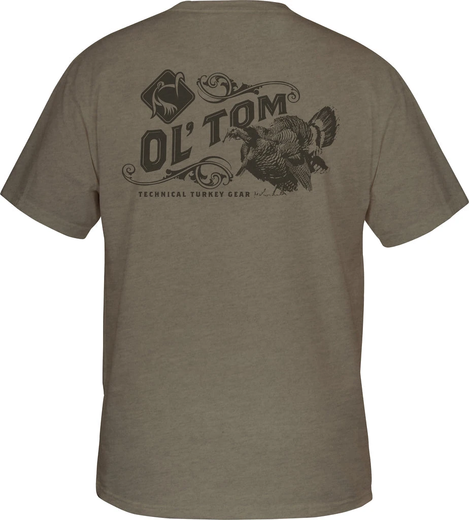 100% cotton tee with a vintage Ol’ Tom logo on the back and an Ol’ Tom turkey logo on the front pocket.