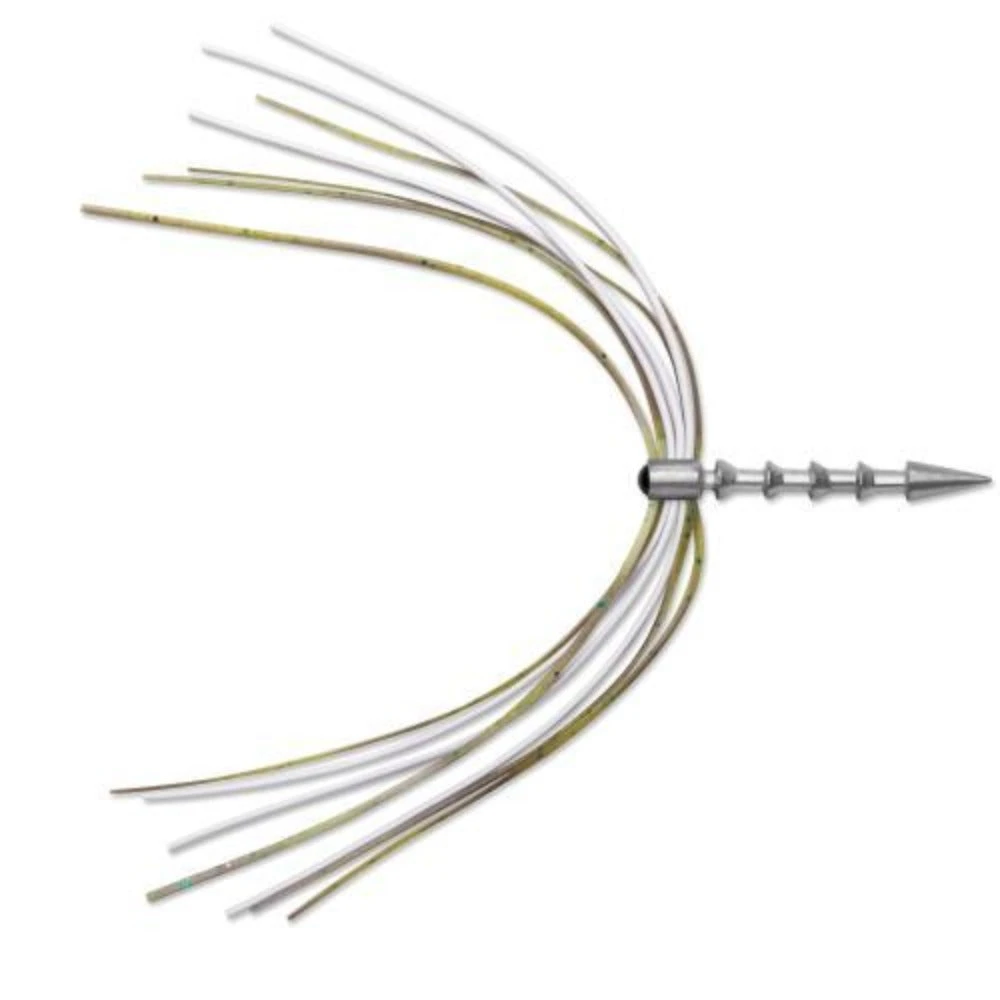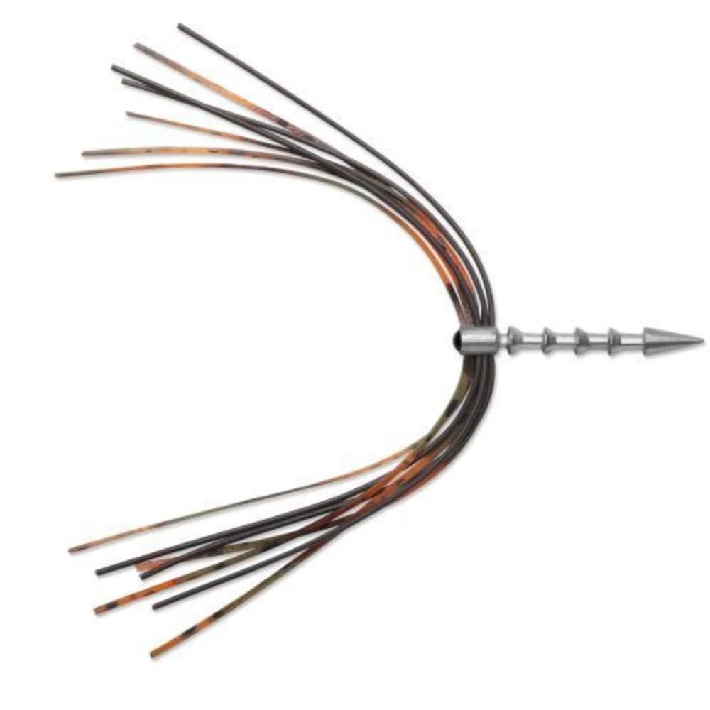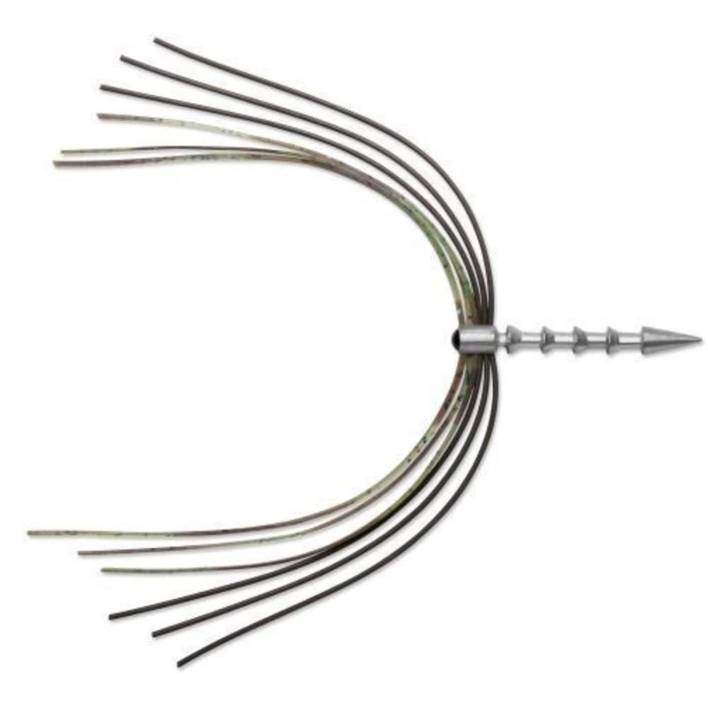 Two-part skirt combining living rubber and silicone material creating a unique action underwater at all temperatures.